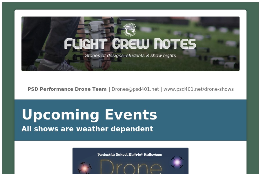 PSD Performance Drone Team | Drones@psd401.net | www.psd401.net/drone-shows Upcoming Events All shows are weather dependent Join Us for a Spooktacular Water. . .