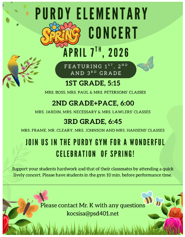 Purdy Elementary Spring Concert is NEXT WEEK.... Tuesday, April 7th 5:15 - 7:30